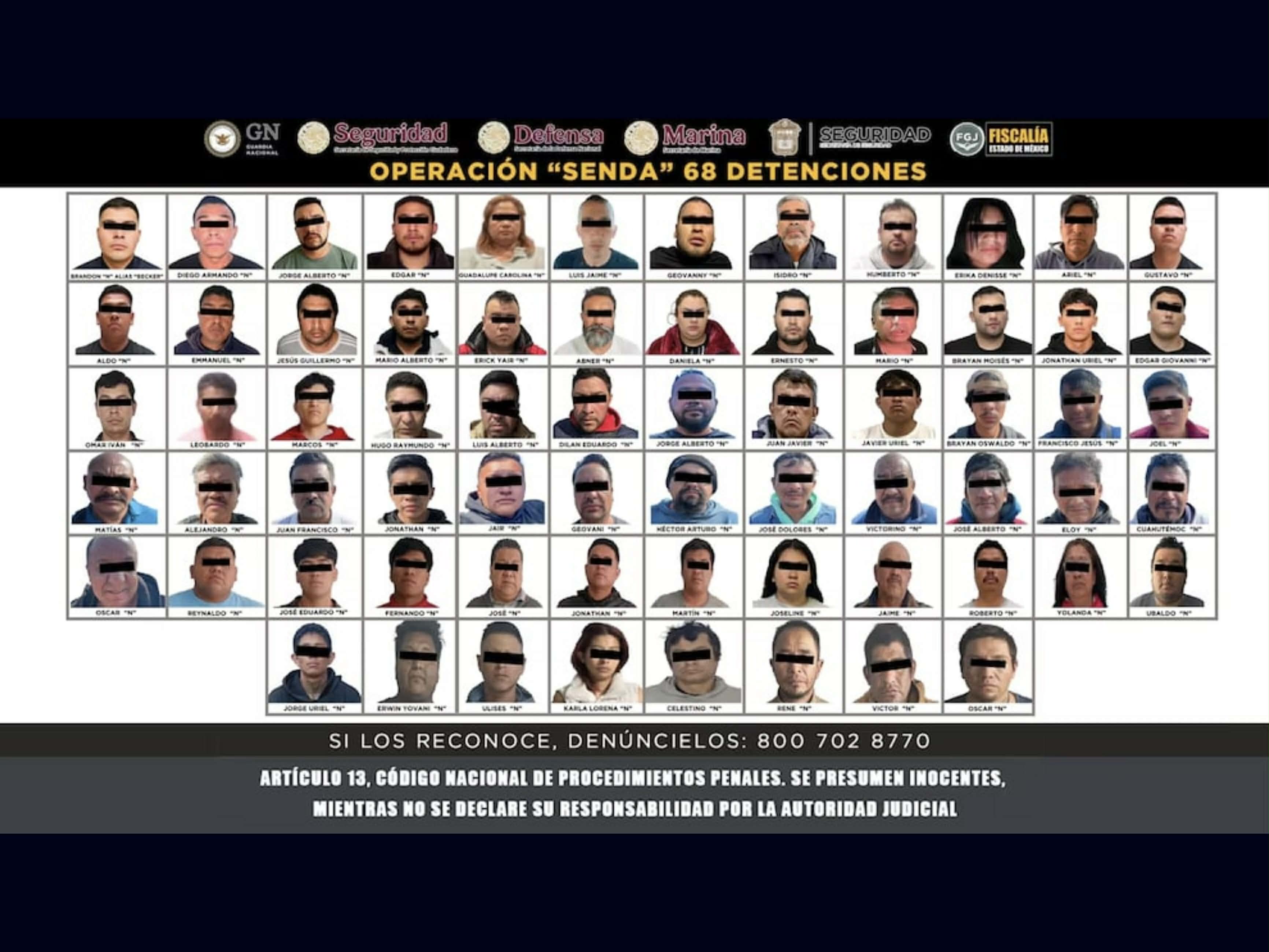 Con el objetivo de combatir el delito de robo a transporte de carga en el Estado de México, autoridades federales y estatales desplegaron la Operación Senda que culminó con la detención de 68 personas, entre las que se encuentran presuntos integrantes de grupos delictivos.